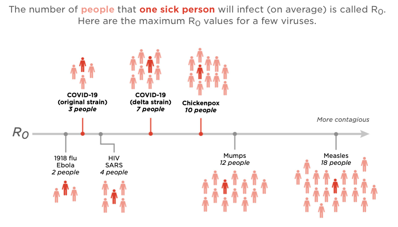 The delta variant has an estimated R0 of 7 and the original strain of COVID-19 has an R0 of 3. By comparison, Ebola virus is less contagious with an R0 of 2, and chickenpox is more contagious with an R0 of 10. See the infographic below for the R0 of other diseases.