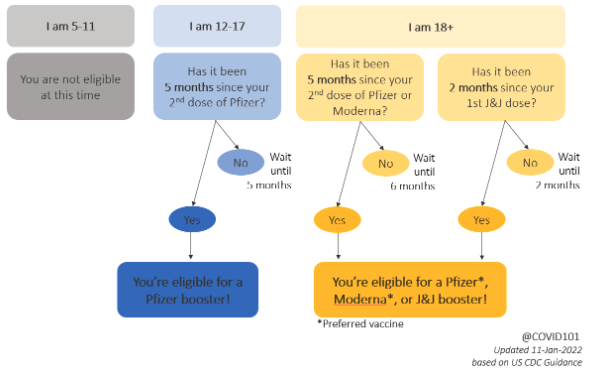 On November 29, 2021, the CDC recommended that all vaccinated people age 18 and older get a booster shot. On December 9, 2021, the CDC expanded their recommendations to encourage vaccinated 16 and 17 year olds to get a booster shot. On January 5, 2022, the CDC again expanded and strengthened their recommendations that all eligible 12-17 year olds should get a booster shot.